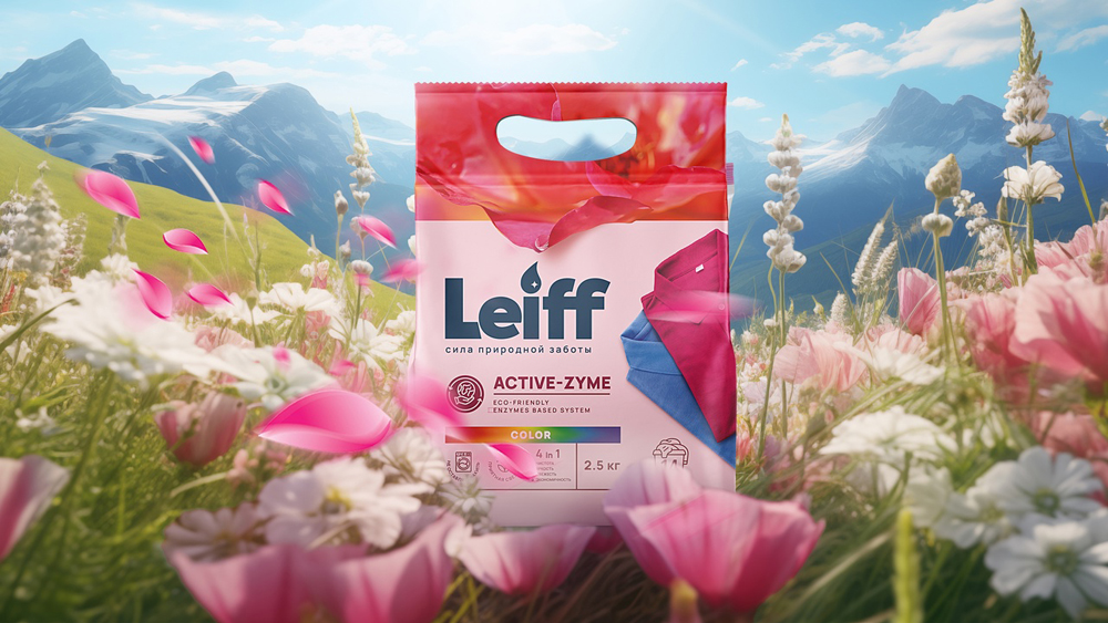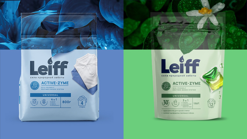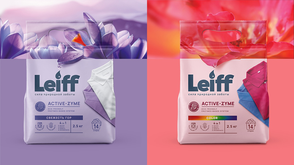 Мягкая, выполненная в минималистичном стиле, однотонная, но в то же время выразительная, благодаря необычной для категории палитре, упаковка выгодно выделяет бренд Leiff на фоне пестрых конкурентов.
