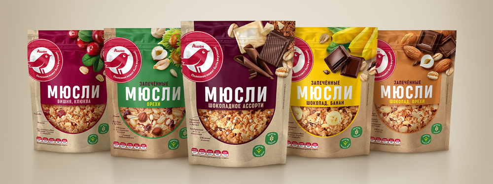 Агентство Quantum Graphics разработало дизайн упаковки для новой СТМ линейки мюсли для АШАНа. Стояла задача сделать продукт, способный отвечать тренду — Полезное может быть вкусным.