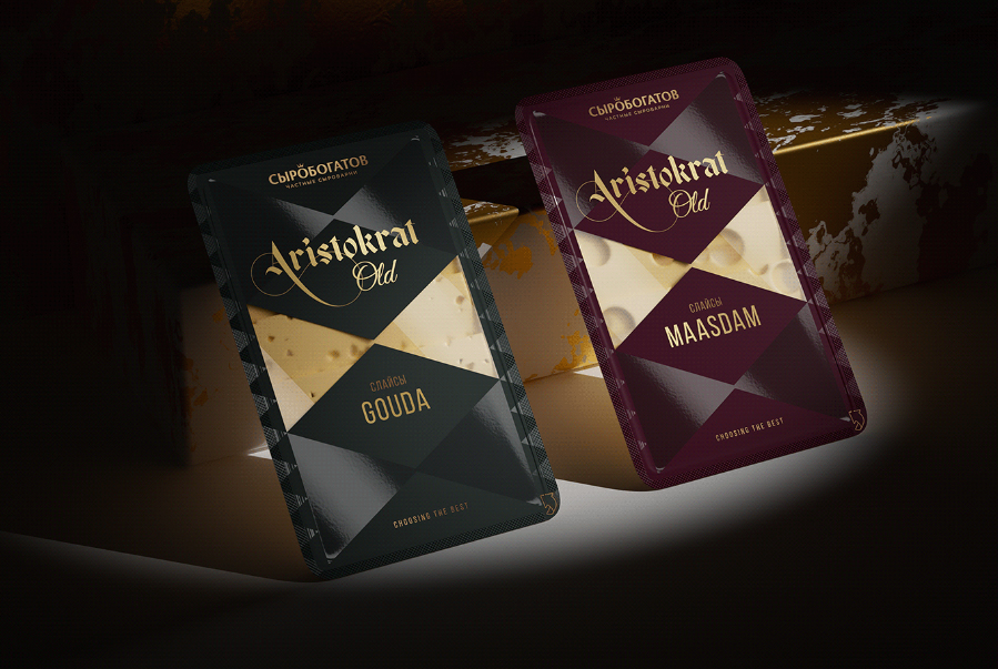 Aristokrat — это премиальные сыры твёрдых сортов. При разработке дизайна упаковки перед брендинговым агентством Commersart стояла задача подчеркнуть элитность продукта.
