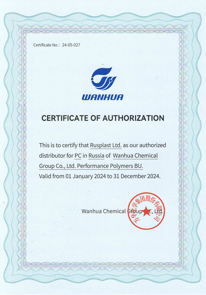 Компания «Руспласт» является официальным дистрибьютором компании Wanhua Chemical Group с 2020 года, сосредоточив основной фокус на поставках поликарбоната (ПК) и полиметилакриалата (ПММА). В 2024 г. Руспласт и Wanhua Chemical Group продлили соглашение об официальных поставках ПК на территории России и СНГ.