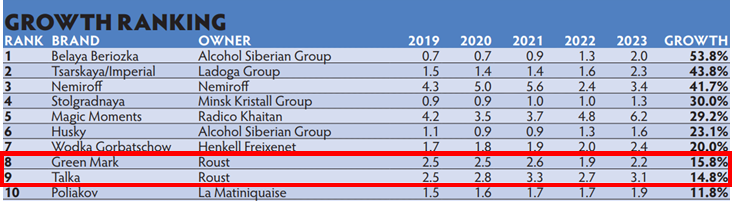 В июне 2024 года был опубликован очередной список «Брендов-миллионеров», реализовавших в 2023 году свыше 1 миллиона 9-литровых коробов, где «Зелёная Марка» и «Талка» показали уверенный рост к предыдущему году и вошли в ТОП-10 наиболее быстрорастущих водочных брендов в мире. Глобальные продажи «Зелёной Марки» выросли на 15,8% и достигли уровня 2,2 млн 9 л коробов, а «Талка» продемонстрировала рост продаж на 14,8%, достигнув уровня 3,1 млн 9 л коробов. В рейтинге самых быстрорастущих водочных брендов в мире «Зеленая Марка» и «Талка» заняли 8 и 9 место, соответственно.