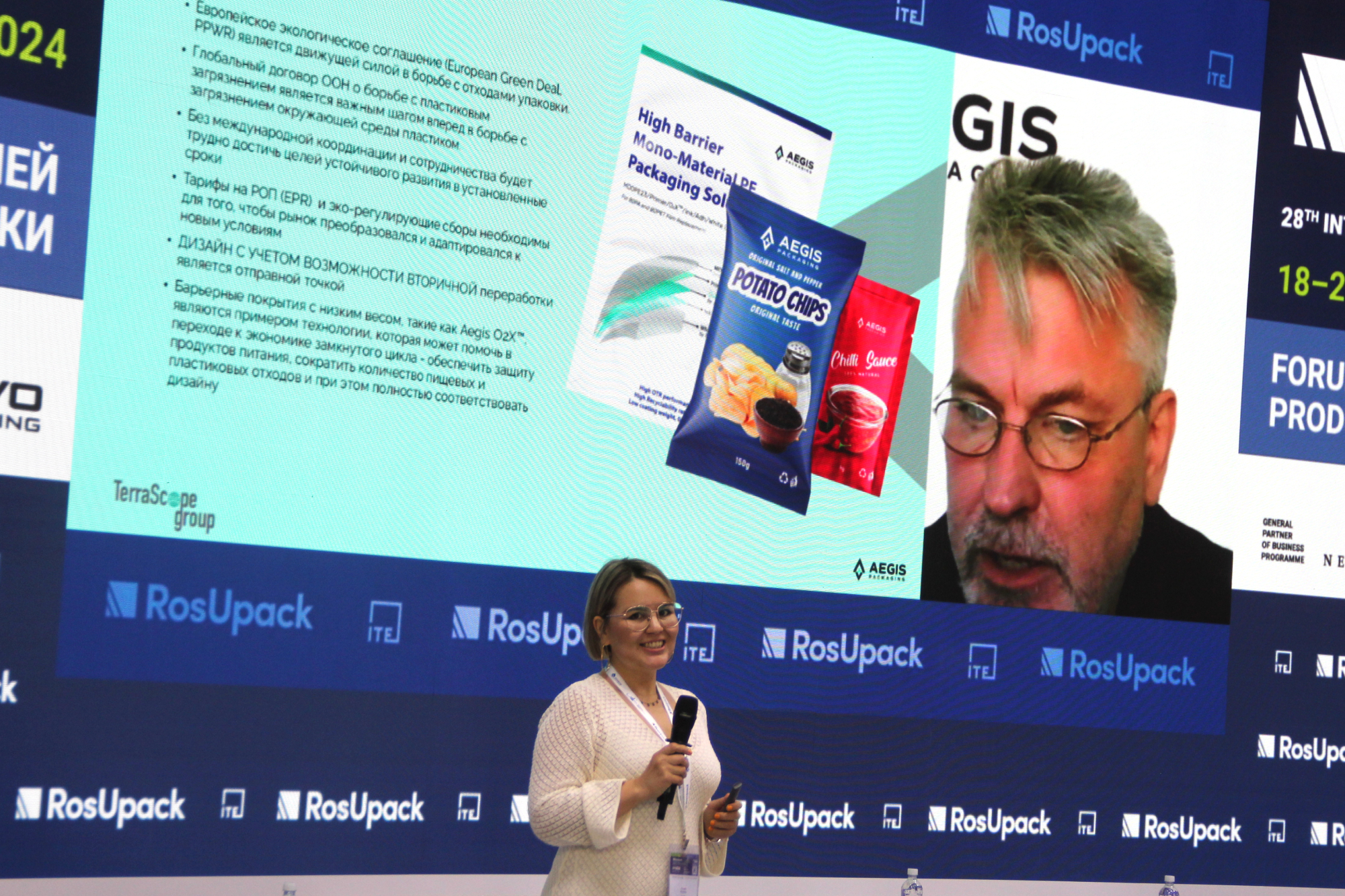 С обзором практик расширенной ответственности производителей (РОП) в Европейском союзе выступили Эльвира Митюкова, директор по развитию компании «Терраскоп Групп» и Йенс Расмуссен (Jens Bidstrup Rasmussen), вице-президент по развитию бизнеса в Европе компании Aegis Packaging. Выступление состоялось во второй день выставки RosUpack, 19 июня, в рамках Дня устойчивой упаковки. Йенс Расмуссен выступал в режиме онлайн.