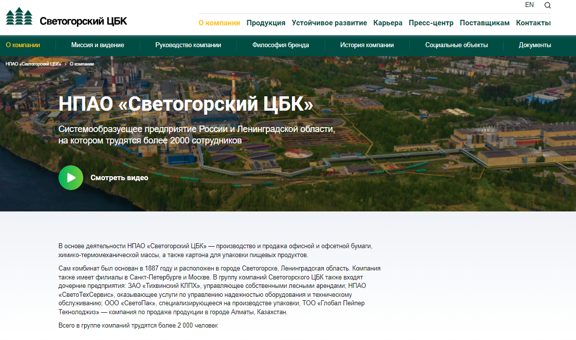 Компания «Светогорский «ЦБК» впервые запустила свой официальный . Предприятие производит офисную бумагу в зеленой пачке SvetoCopy и премиальную Ballet, химико-термомеханическую массу, а также картон для упаковки жидких пищевых продуктов. Вся актуальная информация теперь собрана в соответствующих разделах сайта, выполненных в фирменном стиле, – «О компании», «Продукция», «Устойчивое развитие», «Карьера», «Пресс-центр», «Поставщикам» и «Контакты».