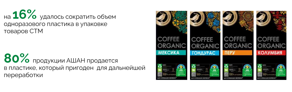 - 80% продукции АШАН продается в пластике, пригодном для переработки;