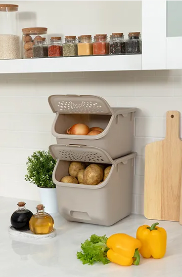Линейка контейнеров для разных видов овощей представлена в двух объемах: 7,8 л и 11,3 л. Прочные контейнеры можно ставить друг на друга, оптимизируя полочное пространство на кухне, балконе или в кладовой. Клапан крышки фиксируется в открытом положении, поэтому его не нужно придерживать руками, и он не перекрывает доступ внутрь контейнера, расположенного сверху. При хранении овощей в контейнерах Phibo плоды удобно пересматривать и перебирать.