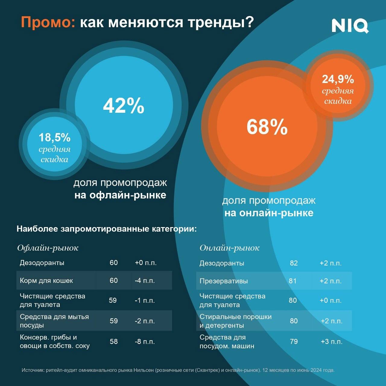 За последние 12 месяцев по июнь 2024 года доля продаж FMCG-категорий со скидками в розничных сетях продолжила снижаться и составила 42% (-8 п.п.), сообщают аналитики NielsenIQ Россия. При этом наиболее сильное снижение происходит в группе продовольственных товаров: -9,6 п.п. в натуральном выражении на фоне стабильности непродовольственной части рынка (менее -1 п.п.).