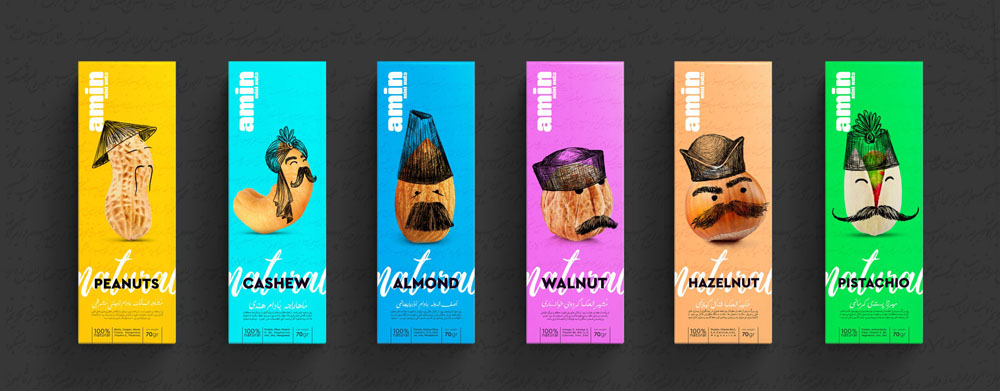 Дизайнерами были созданы персонажи, каждый из которых похож на вымышленного персонажа высокопоставленного чиновника эпохи Каджаров. Каждый персонаж (орех) ассоциируется с регионом, где этот орех был известен, и элементы каждой упаковки ему соответствуют. Цель иллюстраций - донести до целевой аудитории давнее наследие бренда.