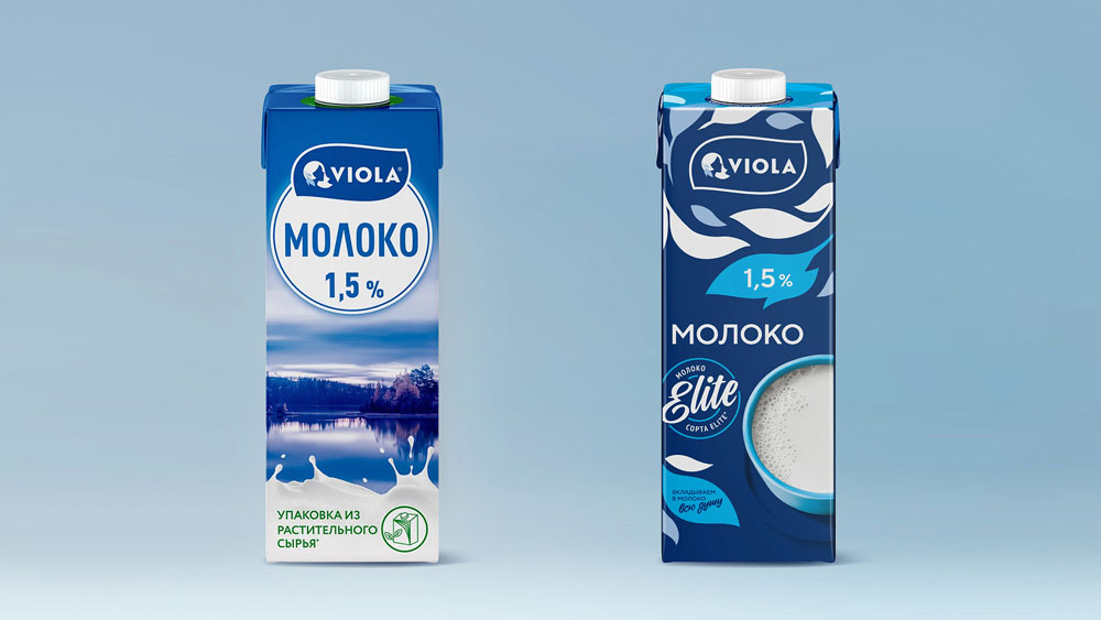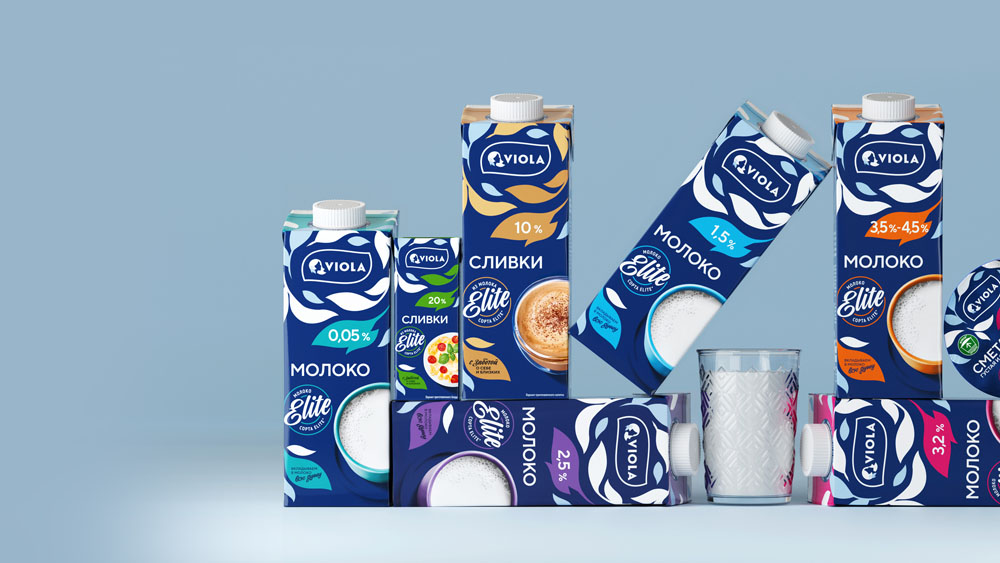 Бренд стал легко узнаваем по графическим элементам в виде листьев, стилистически перекликающихся с формой логотипа. Вместе они образуют единое целое и передают идею легкости и натуральной природности молочных продуктов Viola. Клейм Elite теперь доносит суть качества молока. Новый дизайн запоминаемый, лаконичный, он подчеркивает финские корни бренда. Передает идею чистоты, премиальности и работает на узнаваемость бренда.