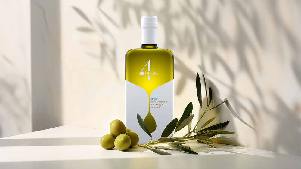 4 Drops (пер: 4 капли) – бленд четырех видов оливкового масла первого холодного отжима. Уникальная особенность отражена в дизайне упаковки. Этикетка оригинальной формы образует каплю масла, по форме напоминающую оливку. Минимализм в дизайне и цветовом решении ассоциируется с чистотой и высоким качеством.