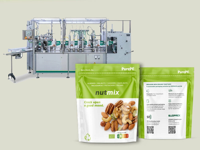 Anyone who wants to see SÜDPACK’s new CarbonLite® film family live in action at FACHPACK 2025 should head to the SN booth – no. 1-317. Once again, the film specialist and the machine manufacturer are working hand in hand – demonstrating that mono-PE stand-up pouches with an integrated PE zipper can be produced efficiently on a standard horizontal pouch packaging machine, thanks to our many years of expertise. The best part? This practical and sturdy pouch making material requires no aluminum or metallization.