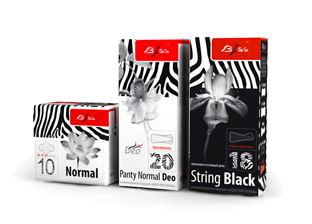 В самое ближайшее время в торговых точках российских городов и стран ближнего зарубежья первой в обновленном дизайне появится линия прокладок на каждый день для изысканного черного белья Bliss String Black и Bliss Panty Normal Black.