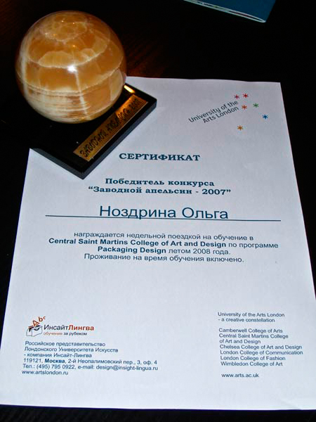 Кульминационным моментом церемонии стало вручение студентке Гуманитарно-прикладного института МЭИ (ТУ) Ольге Ноздриной (работа - упаковка для парфюмерно-косметической серии «Джаз», - получившая Золотой диплом конкурса) – сертификата Российского представительства Лондонского Университета Искусств – на недельную поездку на обучение в Central Saint Martins College of Art and Design, по программе Packaging Design летом 2008 г.