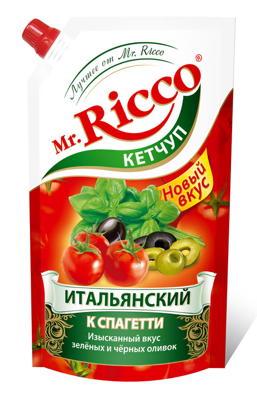 «Mr.Ricco Итальянский» - первый в России кетчуп, в состав которого входят три наиболее популярных ингредиента итальянской кухни: черные, зеленые оливки и пряность орегано. Этот томатный соус лучше всего сочетается со спагетти и макаронными изделиями.