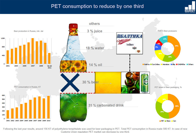 In case of adoption a new Customs Union regulation in Russia, which bans pouring beer in PET bottles, the Russian PET market volume will lose 30%, according to .