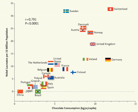 В результате выявилась линейная зависимость (r=0.791, P<0.0001) между потреблением шоколада на душу населения и количеством нобелевских лауреатов на 10 млн населения в 23 странах. Швейцария оказалась лидером в этом отношении. Наклон линии регрессии позволил исследователю сделать вывод о том, что ежегодное потребление шоколада на душу населения в размере 0,4 кг повышает количество нобелевских лауреатов в данной стране на 1. Для Соединенных Штатов количество должно составить 125 млн кг в год. Минимальная эффективная доза потребления колеблется вокруг 2 кг в год. Самый высокий показатель потребления шоколада составляет 11 кг в год.