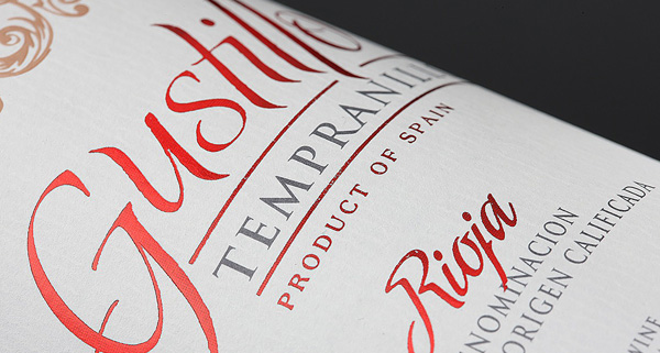 Дизайн серии этикеток “Gustillo” выдержан в строгом стиле. Специалистами агентства было разработано оформление двух линеек вин самого знаменитого винодельческого региона Испании. Для сухих вин использована технология слепого конгрева. При печати же этикеток полусладких вин применялось тиснение различными видами фольги, а так же тактильный лак.