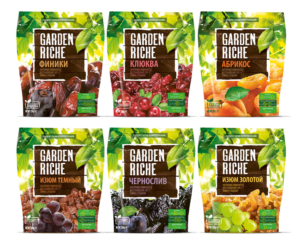 Лицевая сторона упаковки, исполненная в концепции “one shot”, формирует образ продукта и, в целом, настроение у потребителя. Ощущение солнечного дня в летнем саду; простая деревянная садовая табличка, по которой вручную написано краской; аппетитная продуктовая группа из сушеных и свежих фруктов, лежащая в саду – эти и другие элементы коммуницируют органичность и качественность натуральных “фермерских” продуктов, передают и усиливают смысл названия бренда “Garden Riche”.