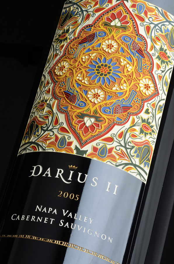 Упаковку для вина Darioush Darius II создавали в компании Etched Images. Орнамент наносили гравировкой, после чего бутылки раскрашивали вручную. Дизайн в стиле ближневосточного гобелена разработали специалисты студии Auston Design Group.