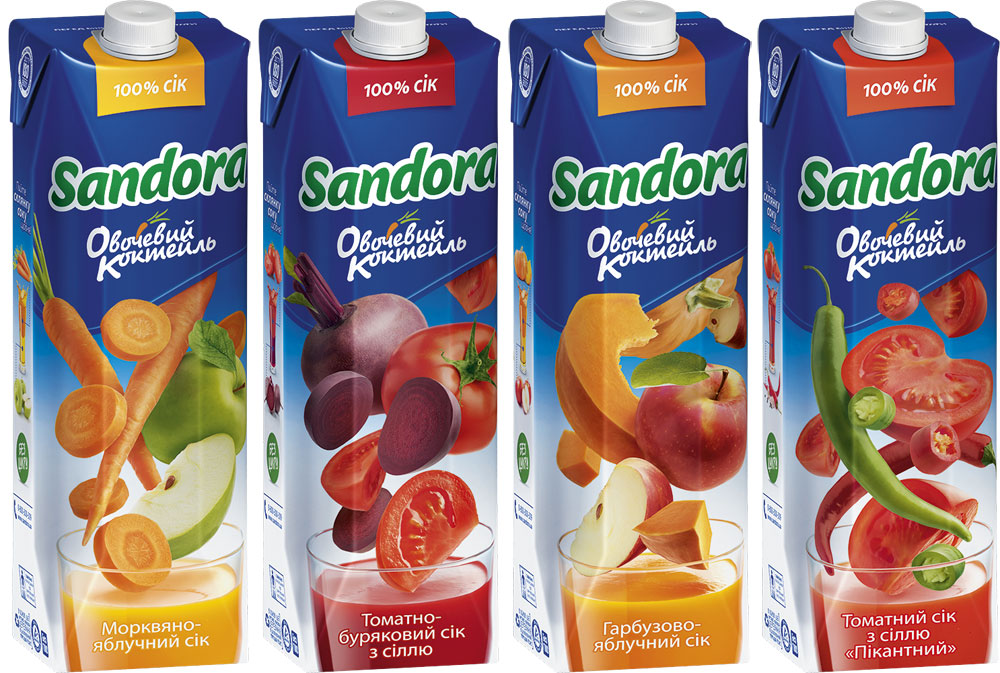 В марте 2013 года ТМ «Сандора» вывела на рынок новую серию стопроцентных соков – «Овощной коктейль». Новая линейка представлена четырьмя оригинальными вкусами: морковно-яблочный, томатный «Пикантный», тыквенно-яблочный и томатно-свекольный.