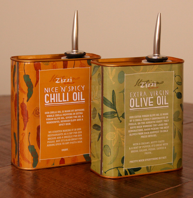 Дизайнер Тобиас Хол (Tobias Hall) разработал дизайн упаковки для оливкового масла итальянской сети ресторанов Zizzi, расположенных в Великобритании.