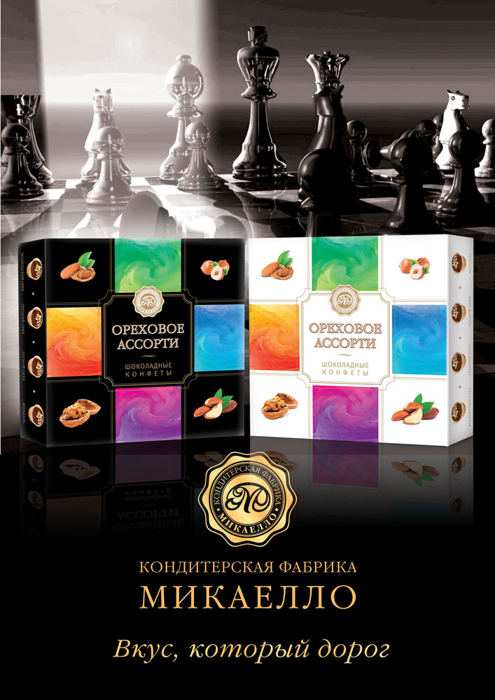 Уже знакомы потребителю конфеты из дробленных бразильских, грецких, лесных орехов и миндаля, покрытых бело-темной шоколадной глазурью, представлены теперь в двух вариантах оформления — светлые и темные коробки в виде шахматного поля.