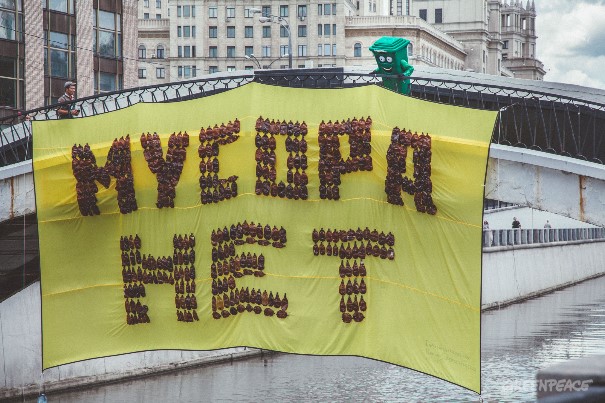 Гринпис повесил баннер из пластиковых бутылок на Яузе