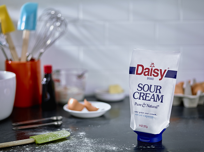 The innovative 14-oz. Daisy Squeeze package is an inverted, wedge-shaped pouch with a flip-top dispensing closure featuring a silicone dispensing valve and a tamper-evident pull ring. It provides an easy-to-use, easy-to-dispense, mess-free, recloseable package. The proprietary pouch design was introduced in February 2015 and is currently available nationwide. Daisy and Sonoco worked with partners Aptar for the closure and Continuum Innovation for the design and development.