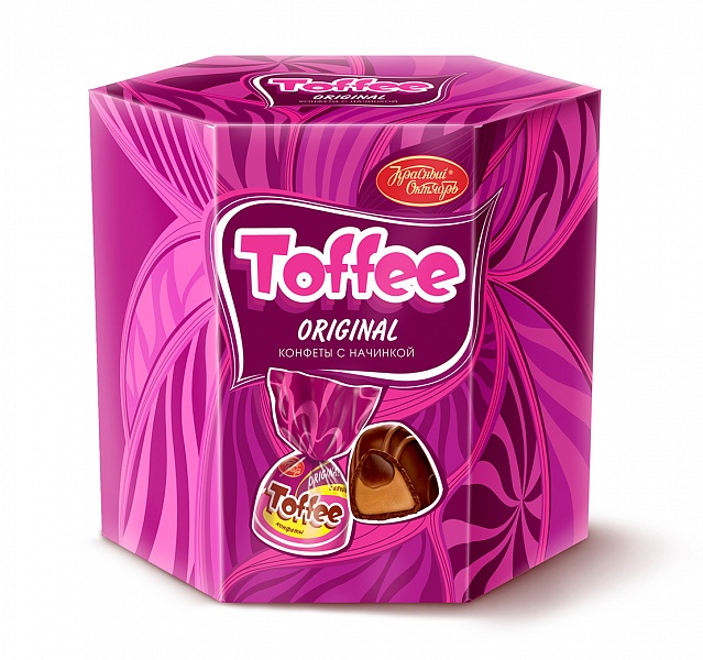 Вторая новинка – это конфеты в коробках «Toffee Original». Отличительная особенность этих конфет – оригинальное сочетание вкуса нежнейшей карамели и шоколада. Начинка «Toffee Original» состоит из мягкой карамели, внутри которой находится желейный шарик с шоколадным вкусом. Конфеты имеют форму купола и покрыты тонким слоем шоколадной глазури. Яркое цветовое решение и оригинальная конструкция коробки привлекает внимание и выгодно выделяет продукт на полках магазинов.