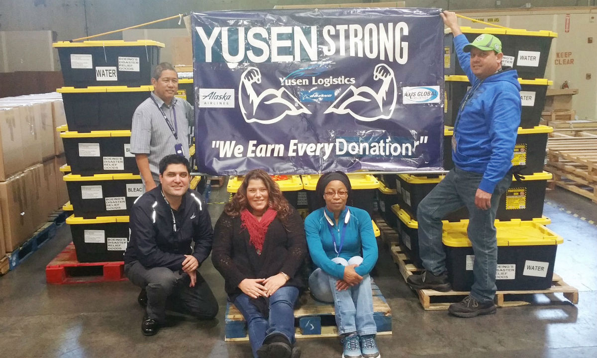 Yusen Logistics provided warehouse services at its Seattle Branch, including receiving, sorting, labeling and re-packing of supplies, as well as delivery to Sea-Tac Airport. The supplies included bottled water, diapers, blankets, sanitizing wipes and other provisions.