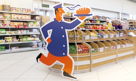 Персонаж активно взаимодействует с продуктами, изображёнными на упаковке: заботливо выбирает лучшие фрукты, довольно обнимает кружку с молоком, по-хозяйски поправляет зелень. Простая графика позволяет с легкостью изменять персонажа и делать его героем самых разных ситуаций. Кроме того, такая иллюстрация легко адаптируется на разные форматы упаковки и одинаково хорошо «ложится» на различные материалы.
