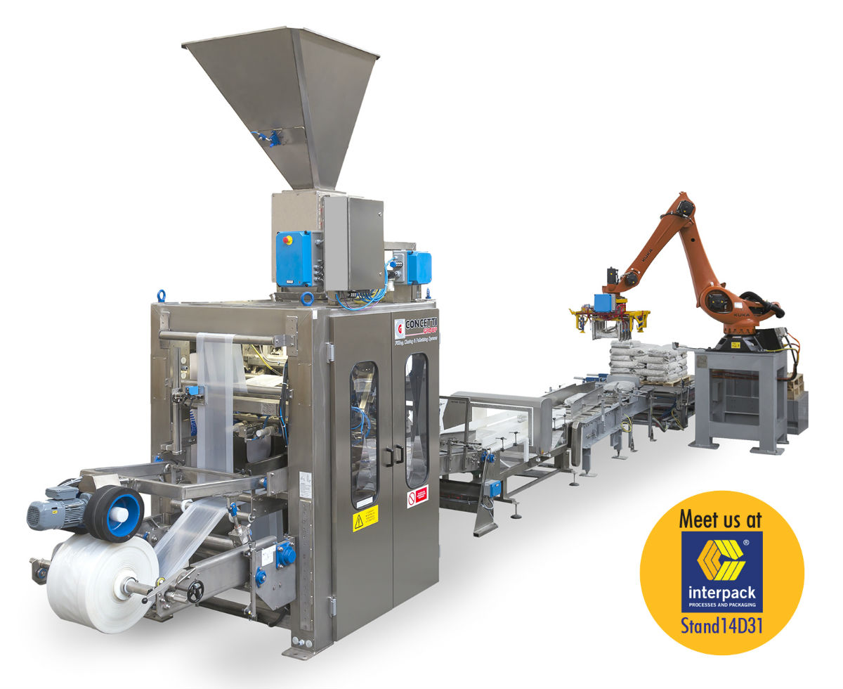 During the Interpack, Concetti will exhibit the innovative and smart FFS-Evolution bagging machine that forms, fills and seals 5-50 bags of free flowing pellet and granular products, from a roll of tubular PE film. This fully automatic line, designed for the petrochemical industry, is equipped with a Kuka anthropomorphic robot palletiser, the fastest and most versatile model for the point – to – point movement.