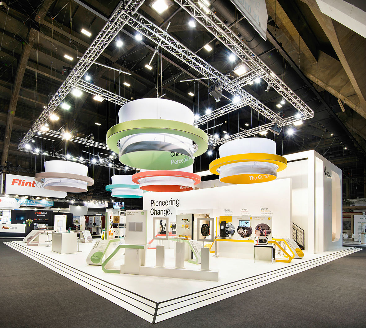 Approximately half the materials in the booth were made from label waste collected from Avery Dennison customers. The waste material was recycled, reprocessed and combined with other recycled cellulosic materials into a product called ECOR® by Noble Environmental Technologies, a global company, providing circular economic solutions to corporate partners in Europe and North America. Noble converted the collected waste into panels that were then used in a number of elements of the booth, including meeting rooms, storage areas, technical areas, floors, walls and an activation zone called “Change The Future.”