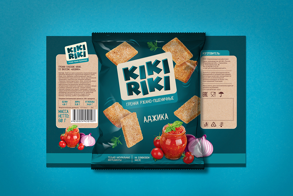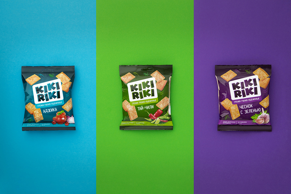 Это решение помогло показать все преимущества снеков KIKIRIKI: упаковка не перегружена дополнительными элементами, благодаря чему на первый план выходит сам продукт — крупные аппетитные гренки очень выигрышно смотрятся на пачке.