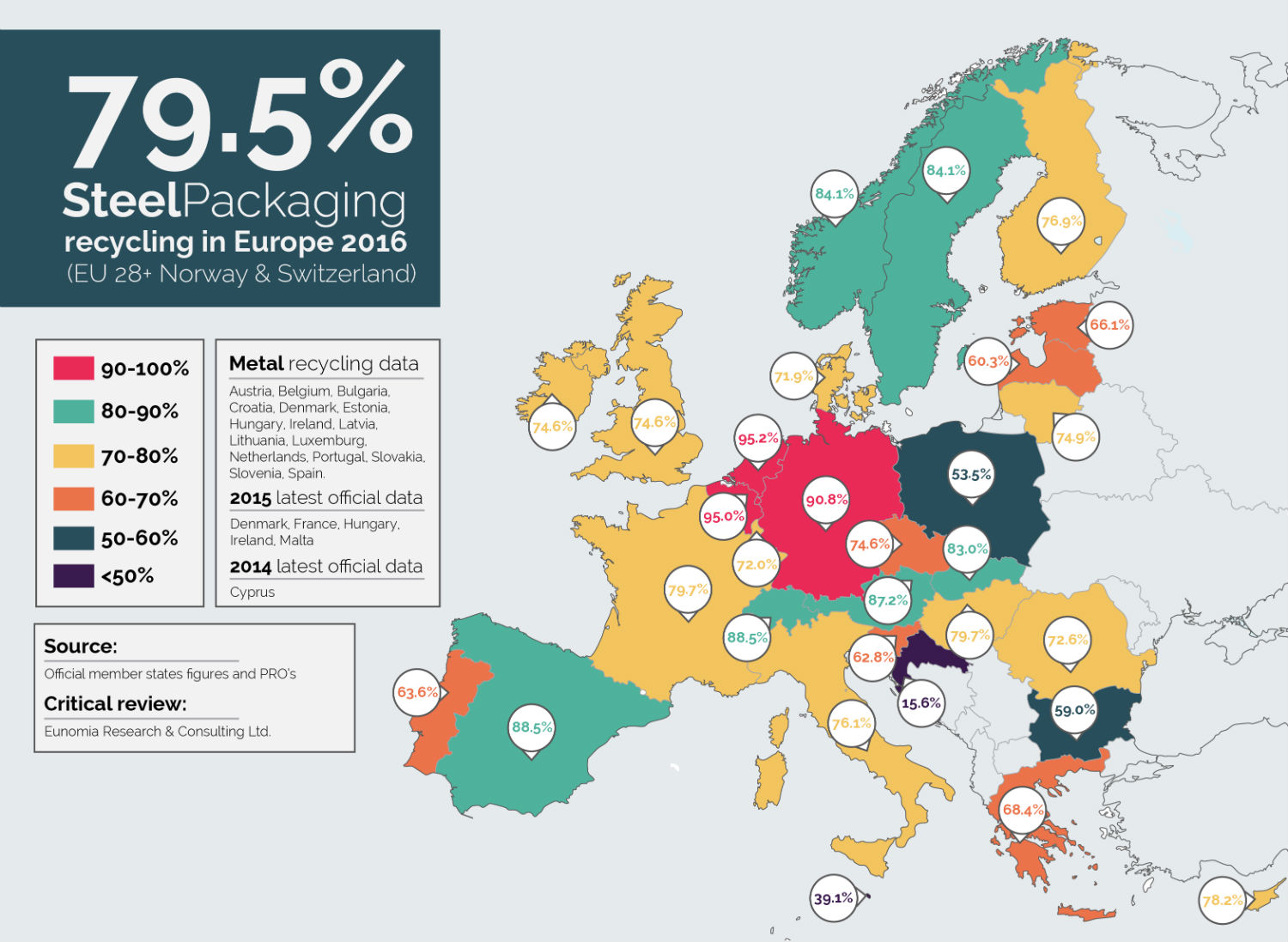 This new all-time high, representing data from 2016, means that for every 10 items of steel packaging put on the European market, close to 8 have been collected, effectively recycled and made available for the manufacture of new steel products.
