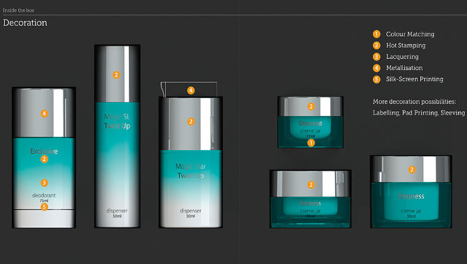 A wide choice of decoration options – such as colour matching, hot stamping, metallizing, lacquering, silk screen printing, labelling, sleeving and pad printing – means packs can be fully individualised to create a strong brand identity on-shelf.