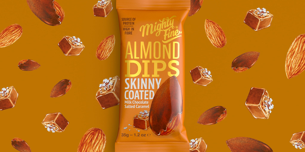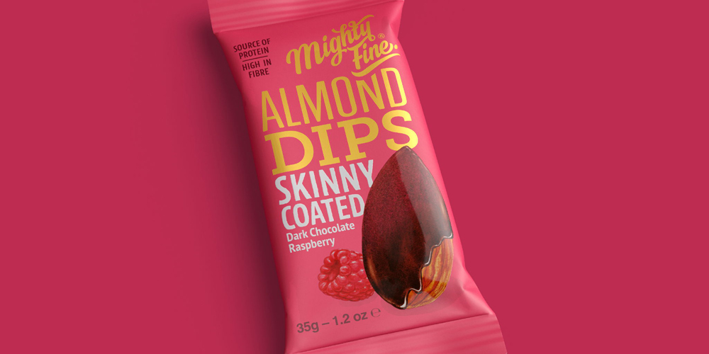 Британская компания Mighty Fine обратилась в студию SoreThumbStudio с задачей разработать новую визуальную айдентику и дизайн упаковки для снеков Almond Dips. Под торговой маркой выпускаются миндальные орехи в шоколадной глазури. Продукт позиционируется как полезный снек.