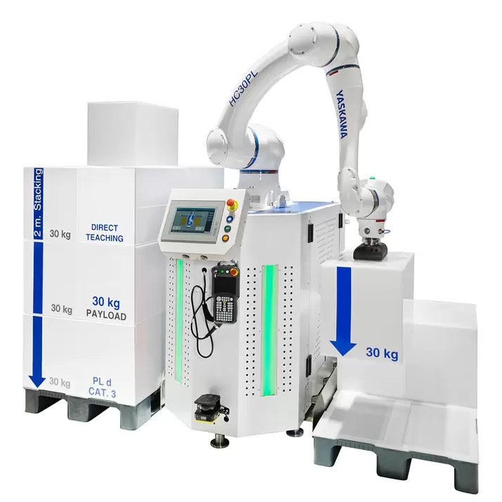 Yaskawa has already successfully implemented numerous cobot palletizing applications with its predecessor model, the HC20DTP. Now the manufacturer is expanding its portfolio by introducing a special cobot palletizer: the HC30PL. With an even higher maximum payload of 30 kg, it can be used in heavy order picking applications in warehouses (palletizing and depalletizing), which are highly strenuous, monotonous, and unergonomic. Due to the cobot’s long reach, every point of a pallet can be reached, allowing a stacking height of 2 m on a standard Euro pallet. Since the cobot operates in a safe, collaborative mode, it can be easily integrated into existing environments entirely fenceless to save space. Therefore, it works completely unaffected by external factors, such as passengers or forklift traffic. By adding laser scanners that detect the distance between cobot and operator, the operation speed adapts situation-specific and enables high-speed operation of up to 2 m/s for cycle time optimization.
