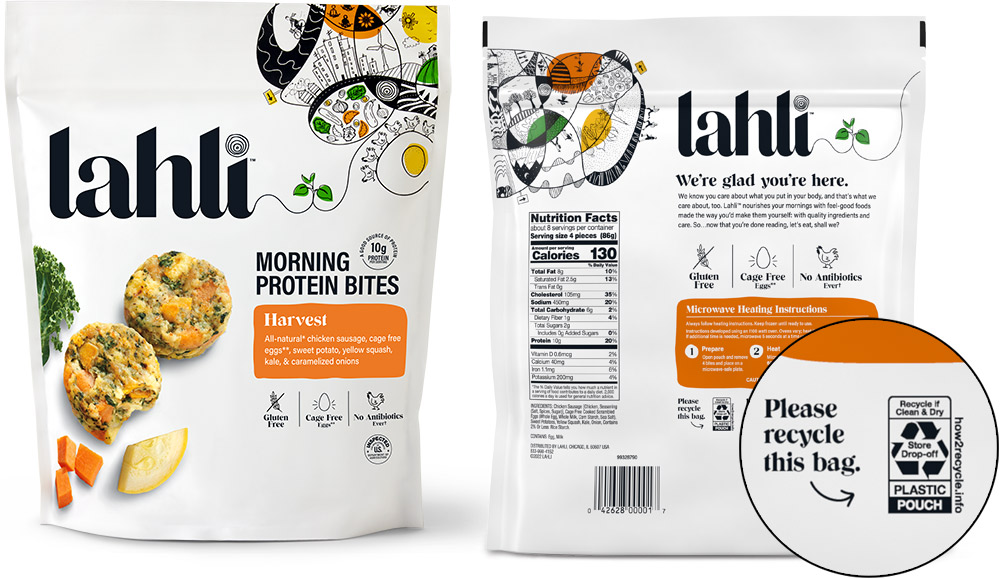 - To aid recycling efforts, the pouch carries a How2Recycle® label for the PE stream, clearly communicating store drop-off recycling instructions.