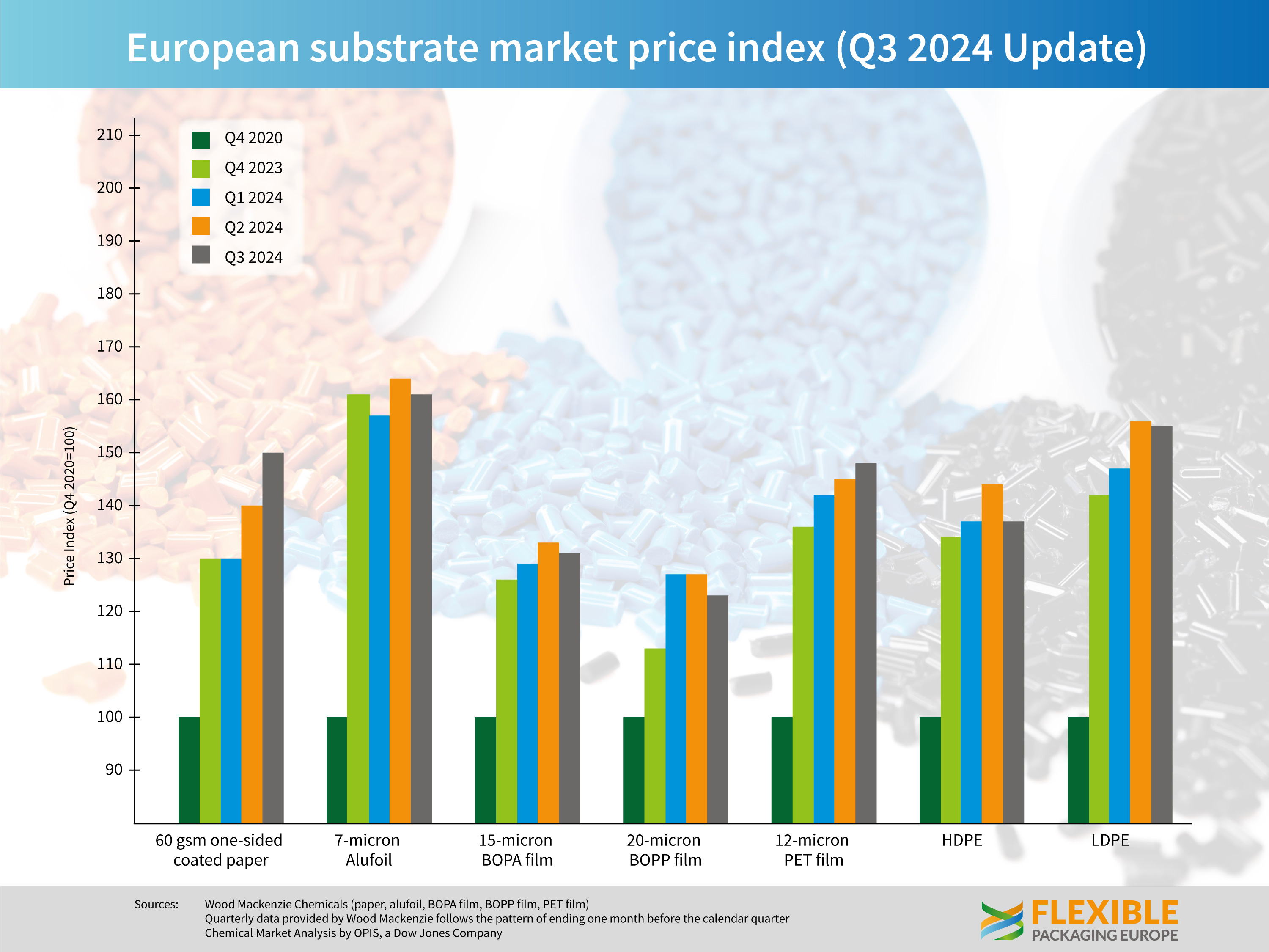 Santiago Castro from Wood Mackenzie commented on the figures as follows: “Prices paid in Europe for flexible packaging materials varied in Q3 2024, driven by price fluctuations in raw materials, logistics and offshore markets. BOPP, BOPA, and Alufoil experienced slight price reductions due to declines in raw materials. BOPET prices increased due to higher freight costs, while paper prices experienced rises due to higher pulp costs, which have been attributed to stronger demand. Flexible packaging demand continued to increase in Q3. The increase was mainly organic but partly due to some restocking. However, stocks continue to be low across most converters. Prices are expected to remain stable for most substrates during Q4, besides paper, which is expected to see further increases. “