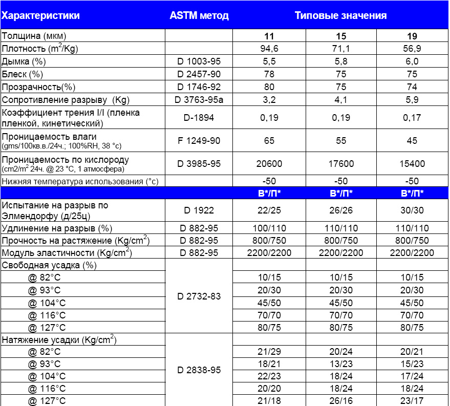 Примечание: Принятые единицы измерения для пленок Cryovac®. Не должны рассматриваться как ограничивающие показатели