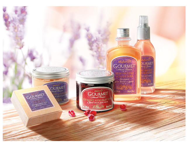 Потребительский департамент Depot WPF разработал логотип, дизайн этикеток и дизайн упаковок для первых двух серий Gourmet: «маракуйя и папайя», «гранат и белый чай». Специалисты агентства стремились отразить премиальность и высокое качество Gourmet – так появилось цветовое решение; изысканность, которая была воплощена в шрифте логотипа, и натуральность – прозрачная упаковка, демонстрирующая текстуру продукта. Всего было сделано 10 SKU: натуральное мыло, эссенция для ванны и душа, лосьон и гоммаж для тела, крем-масло.