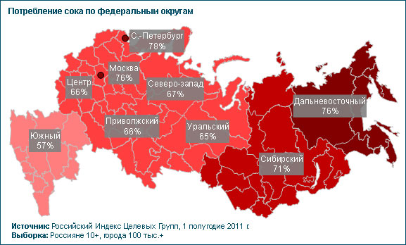 Самая высокая доля потребления соков приходится на Москву, Санкт-Петербург, а также Сибирский и Дальневосточный федеральные округа, где потребление находится в районе 70-80%. Наименьшая доля потребителей соков отмечается в Южном федеральном округе (57%).