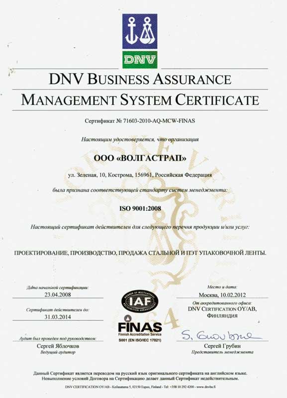 The enterprise Quality Management System has been certified in accordance with ISO 9001:2008 by DNV company. The issued certificate is valid for the following products and services: “Steel and PET strapping design, manufacturing and sales”.