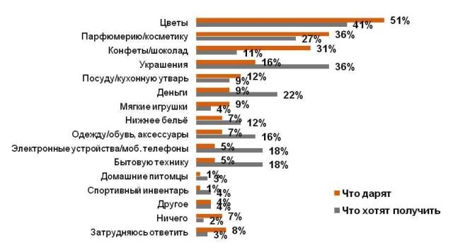 По результатам опроса можно сделать вывод, что цветы, парфюмерию, шоколадные изделия, посуду и мягкие игрушки женщины получают в подарок чаще, чем им хотелось бы. А вот предметы гардероба, такие как одежда, обувь, аксессуары и нижнее белье остаются явно недооценными в качестве возможного подарка, хотя далеко не каждый мужчина решится самостоятельно выбрать их. Более дорогостоящие украшения, электронные устройства, мобильные телефоны, бытовая техника и просто наличные также реже встречаются со своими счастливыми получательницами, чем им того хотелось бы.