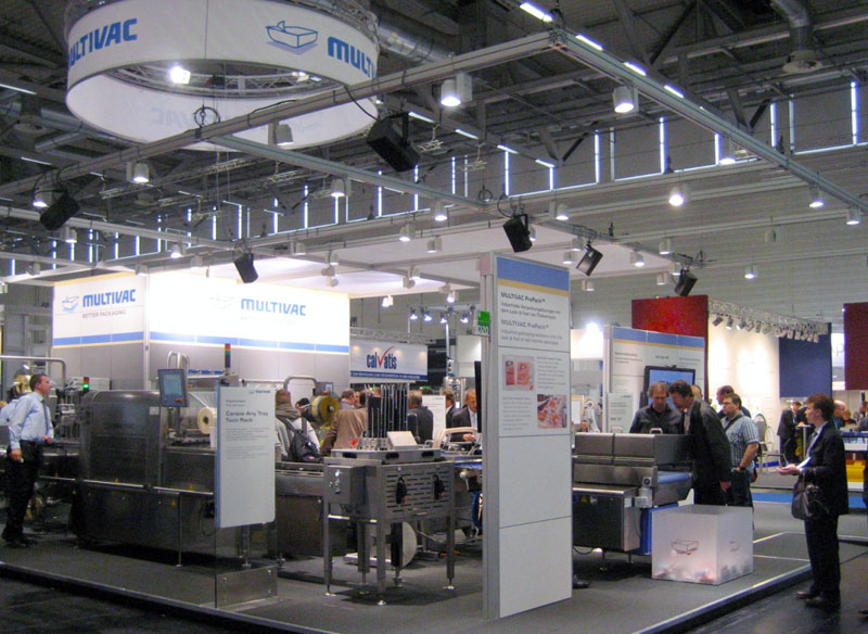MULTIVAC exhibited its high-end T 700 traysealer in an integrated packaging line. In front of many visitors' eyes the twin lane machine automatically matched its speed and travel movements to the desired output. It worked efficiently and reliably in all its processes. The denesting of the trays was performed by a Carsoe tray denester and the line was equipped with the H 130 handling module with 4-axis robot for placing the finished tray packs into outer cartons.