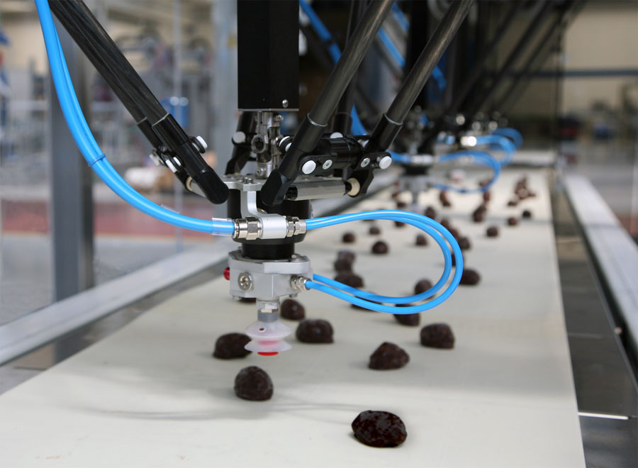 To meet the Ozersky needs the Cama packaging line is composed of four in line Triaflex Delta Robots, which by means of a “smart” vision system can pick loose, naked candies, covered in chocolate, coming randomly from production line and position them correctly on continuous motion conveyors in a pre-set pattern.