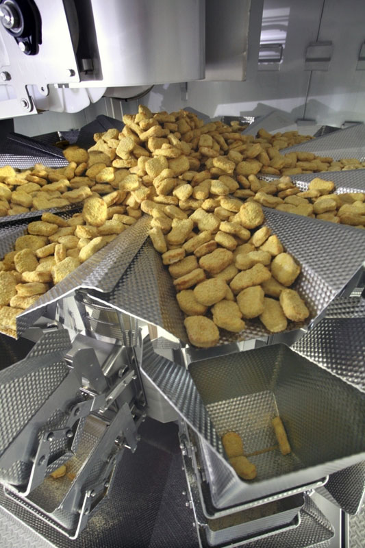 Весовой дозатор «Ishida» серии RS специально разработан для аккуратного обращения с продукцией, имеющей сложные свойства текучести, как например, наггетсы компании «Fredag». Частота вибрации дозатора и его системы подачи могут регулироваться для равномерного перехода продукции в чашки дозатора. Во избежание прилипания продукта к дозатору, все контактные детали сделаны из рельефной нержавеющей стали, а все позиции перевалки сконструированы так, чтобы панировка на наггетсах сохранялась нетронутой.
