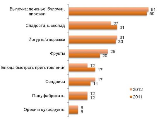 Исследовательский холдинг Ромир в сентябре 2012 года провел опрос среди городского населения страны на тему перекусов и обедов на работе или учебе. Аналогичный опрос проводился ровно год назад – в сентябре 2011.