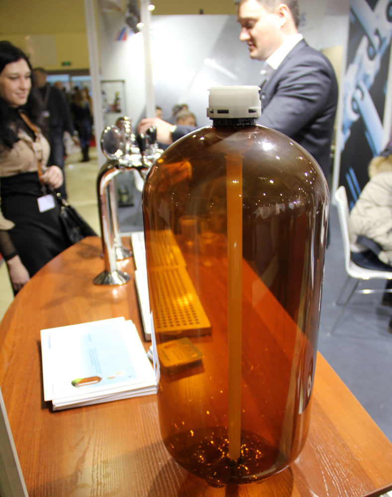 Немецкая компания KHS, один из ведущих производителей систем розлива, наполнения и упаковки напитков, пищевых и непищевых продуктов, представила на своем стенде готовые кеги Petainer, которые производятся из полиэтилентерефталата (ПЭТФ) с небольшой примесью нейлона и коричневого пигмента. В этих кегах применяются специальные барьерные технологии, позволяющие сохранять содержимое с надлежащим качеством.