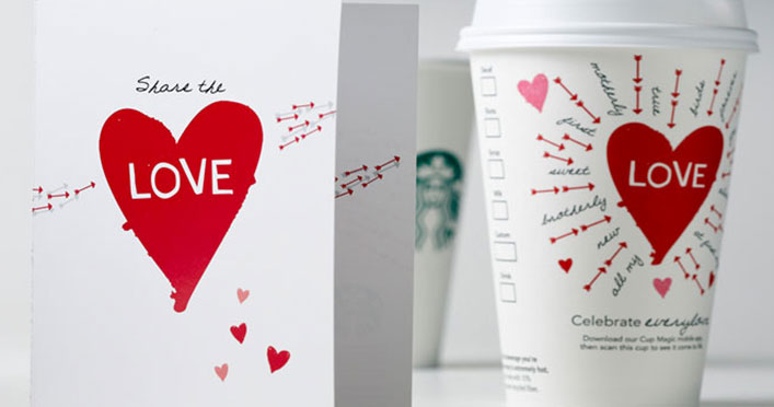 В этом сезоне пластиковые стаканы для кофе Starbucks стали оригинальными «валентинками». Дизайн чашек был разработан подразделением Starbucks Global Creative и маркетологами из отдела цифровых технологий. Новый дизайн стаканов стал частью рекламной кампании, приуроченной ко дню св. Валентина. Также специально к празднику кофейня выпускает открытки для покупателей.